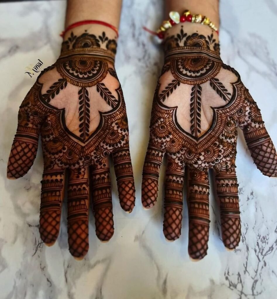 Traditional full hand mehndi designs hamesha se Karwa Chauth ka sabse popular choice rahe hain. In designs mein bharpur detailing hoti hai jo haathon ko ek rich aur festive look deti hai. Is tarah ki mehndi mein aksar dulha-dulhan ke motifs, jaali work, paisley patterns aur floral elements ka use hota hai. Yeh designs thode complex hote hain aur lagane mein time bhi lagta hai, lekin jab yeh complete ho jaate hain toh unki beauty dekhne layak hoti hai. Agar aap ek royal aur classic look chahti hain, toh traditional mehndi designs aapke liye perfect rahenge.