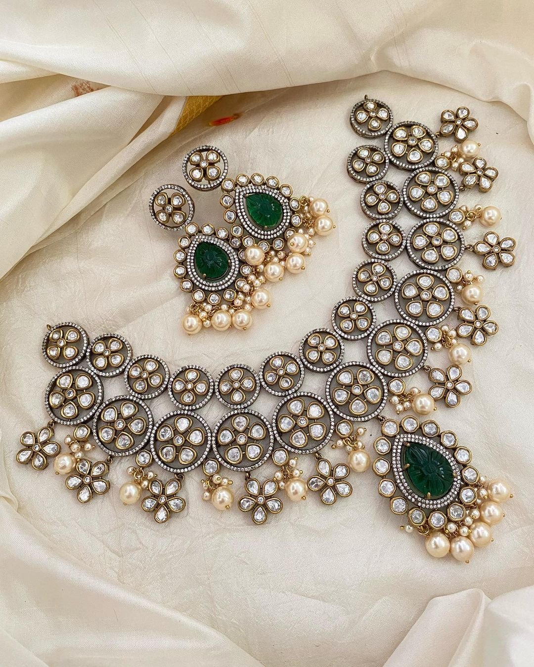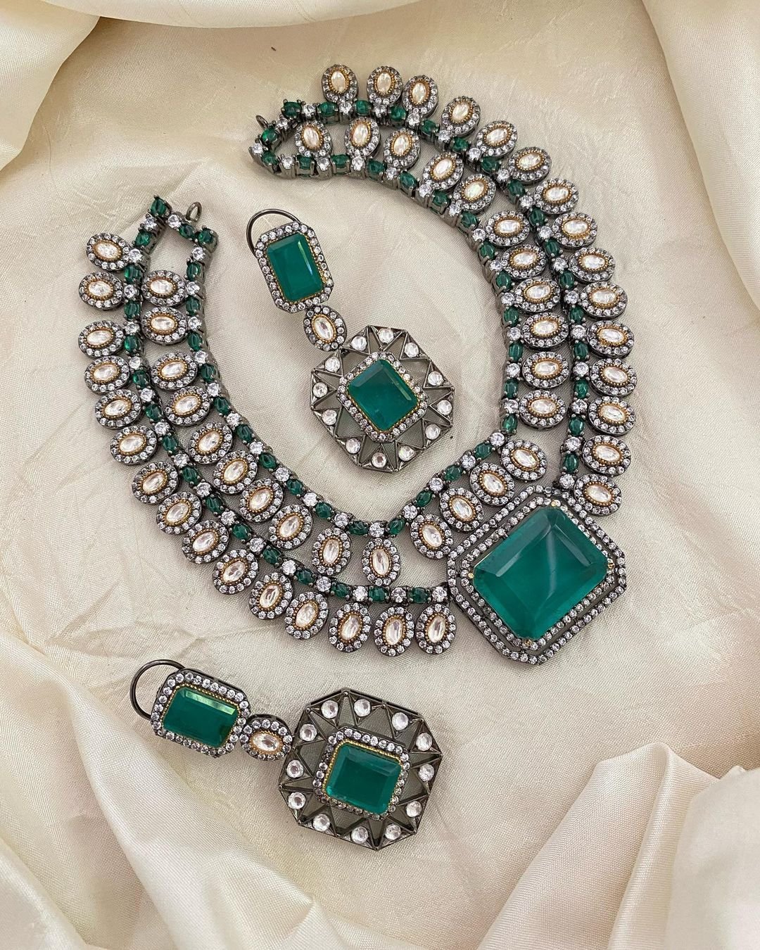 Aqua Green Color  Victorian Diamond Short Necklace Design