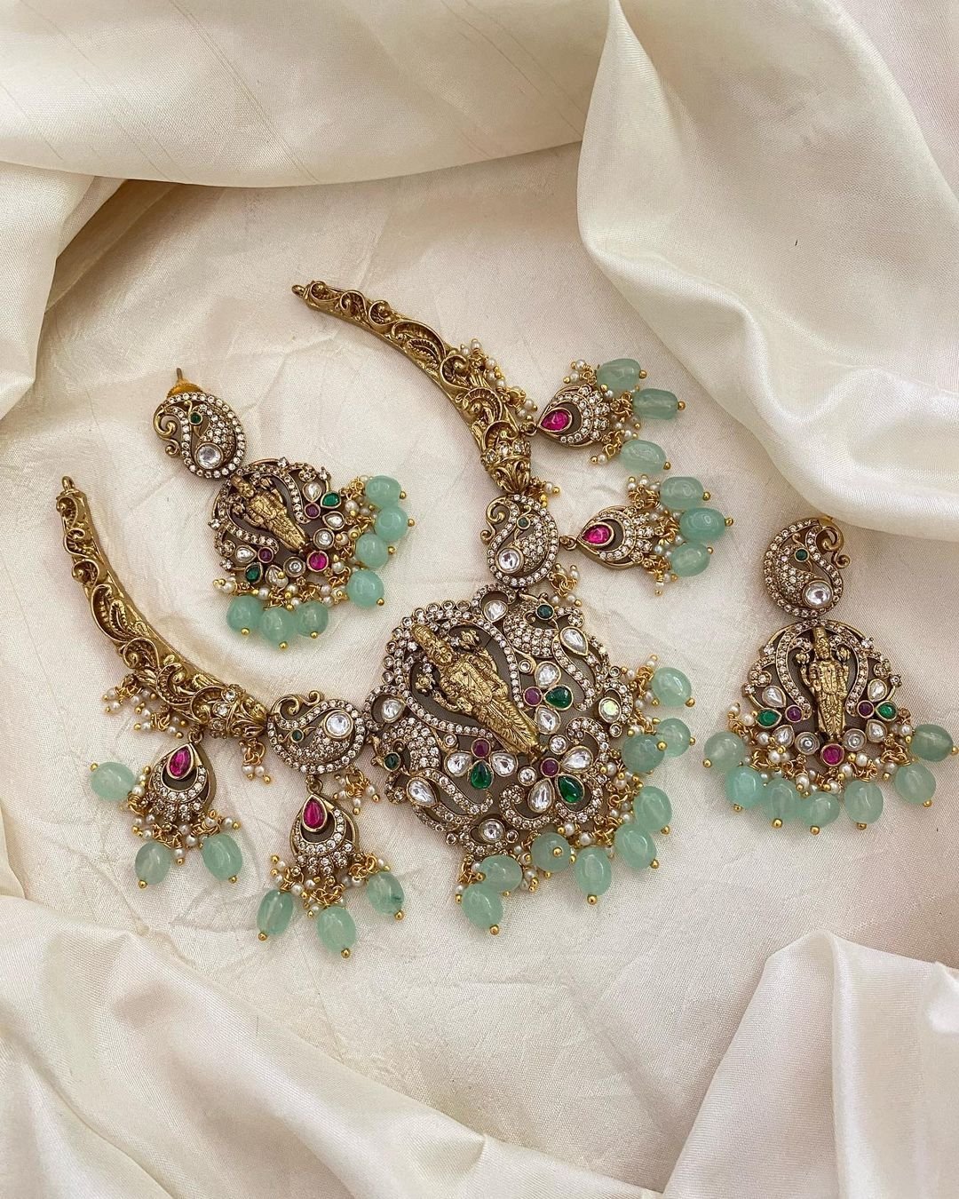 Pastel Green Color Beads Victorian Diamond Temple Necklace Design